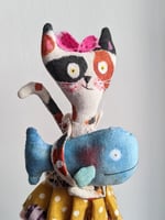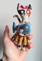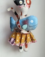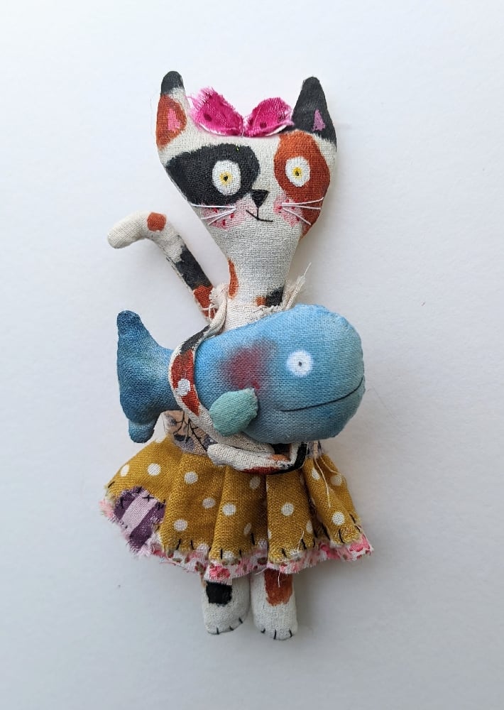 Kitty is made from textile painted in calico colours (acrylic paint). She wears a nice outfit with a pretty yellow polka dot skirt and a pink bow on top of her head.