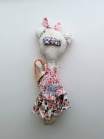 This little bear is delighted to take a picture with her favourite doll. They are both made from textiles stained with coffee for a beautiful and unique colour. The little bear is wearing a pink floral top and a skirt with some other types of flowers. She has beautiful red cheeks, like strawberries, and wears a matching bow on the top of the head.