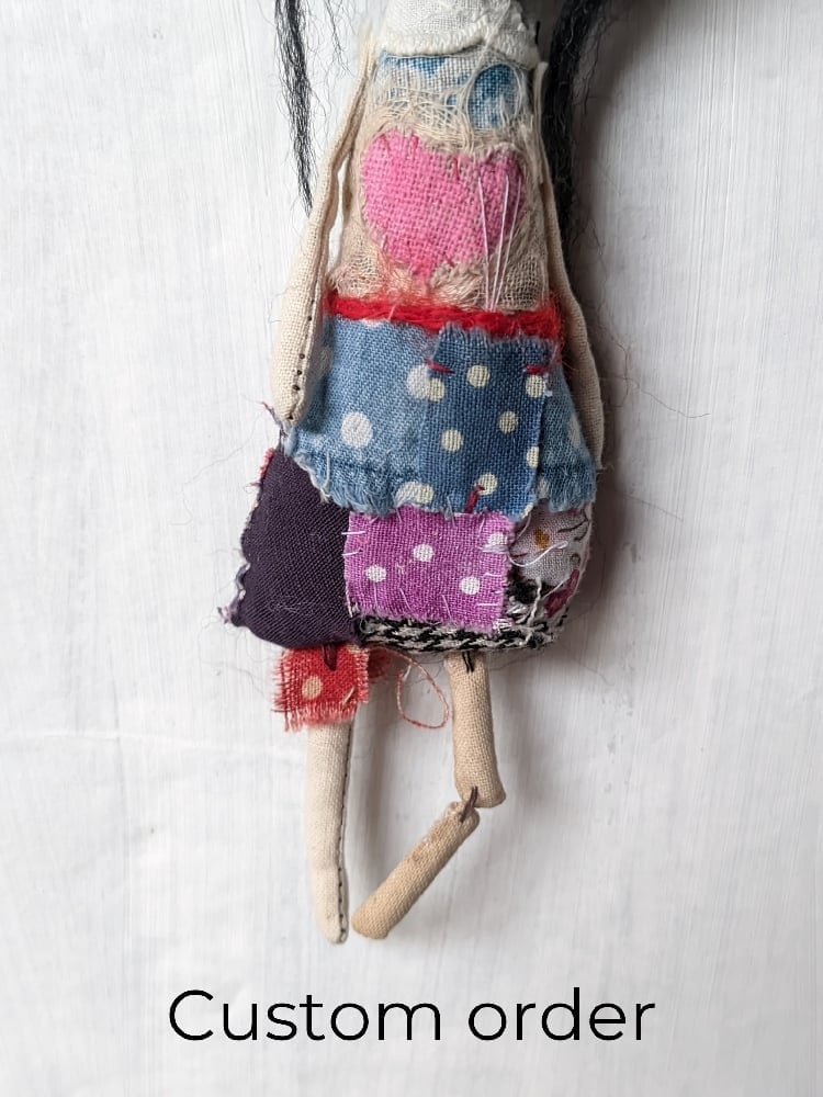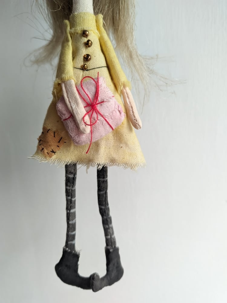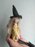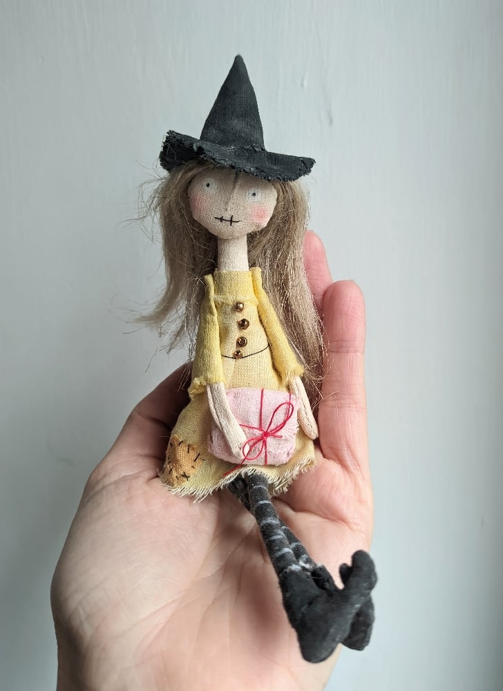 As agreed, a little witch (approximately 7 inches tall) in a yellow dress with black boots and stripy tights.