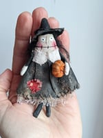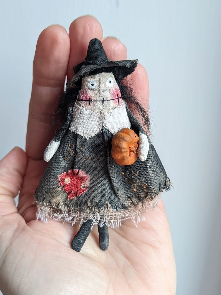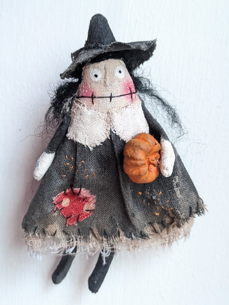 She is made from calico cotton that I have painted with black acrylic paint. Her hair is made of black felting wool, her legs are slightly dangling and she holds a mini pumpkin in her left arm.