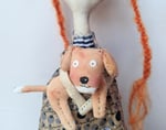 The girl's hair is made of plaited mohair wool. Her smile is stitched, her eyes are drawn with acrylic markers.