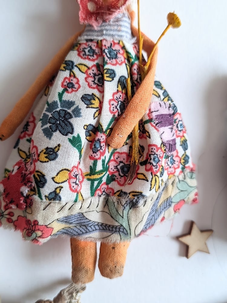 Her dress is made from a mix of new and upcycled materials with a few patches here and there. In her arms she holds a bunch of yellow garden flowers (painted with acrylic).