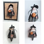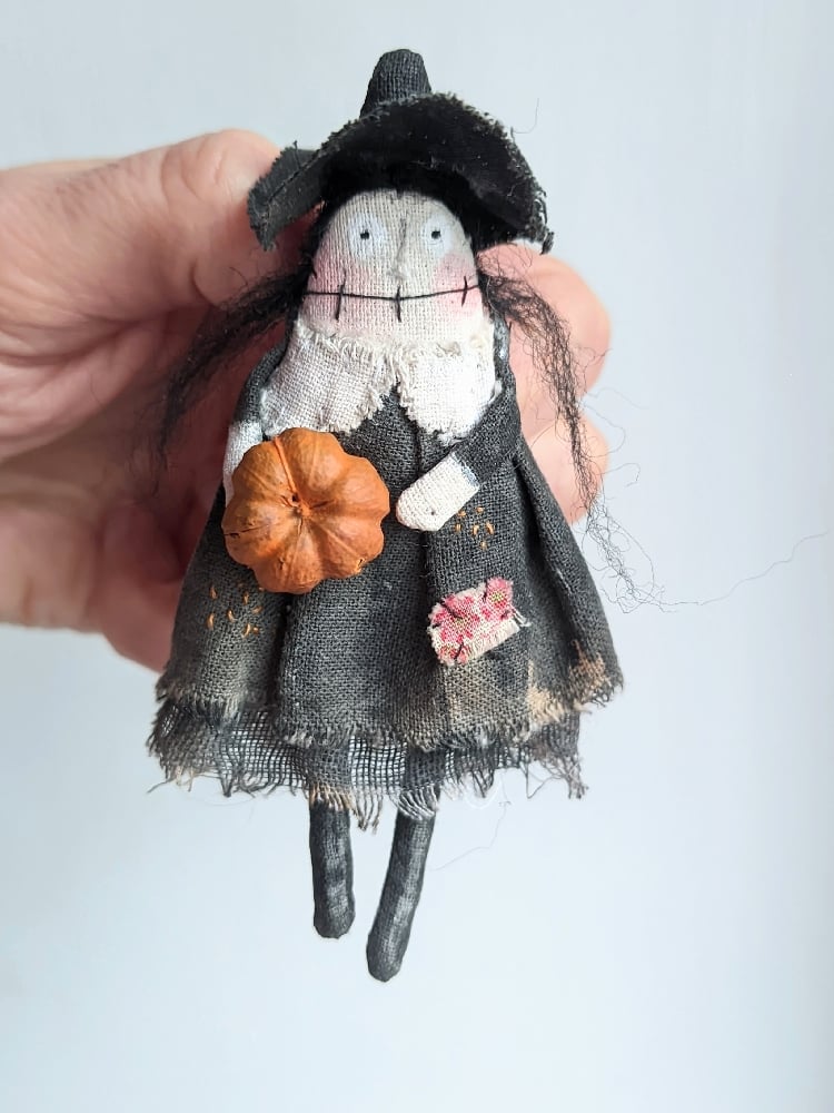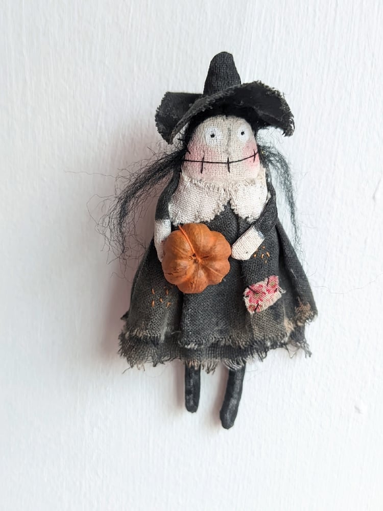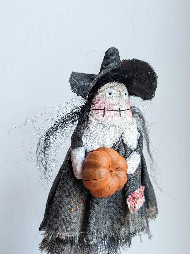 She is made from calico cotton that I have painted with black acrylic paint. Her hair is made of black felting wool, her legs are slightly dangling and she holds a mini pumpkin in her left arm.