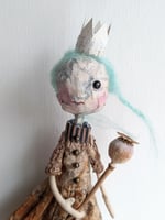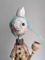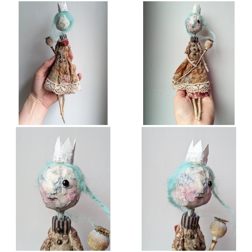 She is handmade from a mix of new and upcycled materials. Her head is covered with papier mâché. I have used thick pages for the last layer and it gives her face an uneven texture that I find beautiful. I have drawn red lips and she has a single black glass eye. Her hair is made of blue/green felting wool styled in loose plaits. Her crown is simply some watercolour paper with papier mâché at the bottom.
