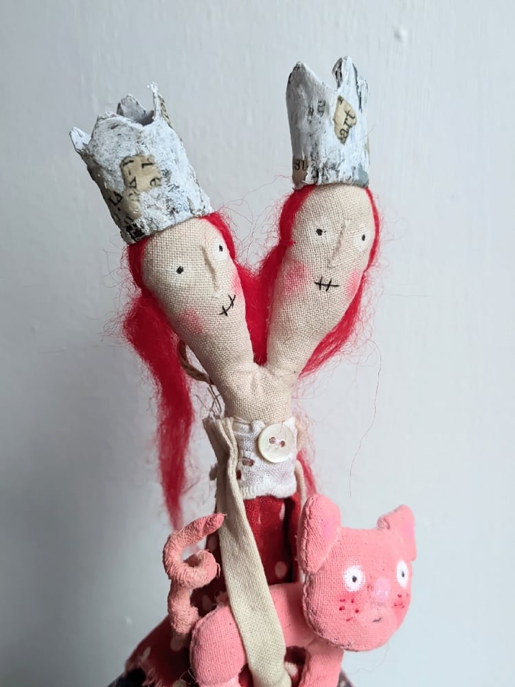 In their arms, they are holding their precious little friend made from fabric and paint. Each sister wears a crown made of papier mâché.
