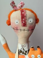The doll is made from calico stained with coffee. The face is a mix of stitched and painted features while her hair is made from a vibrant orange felting wool.