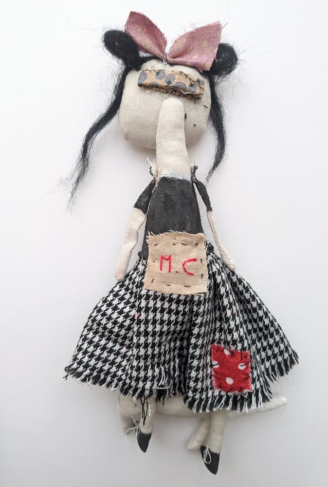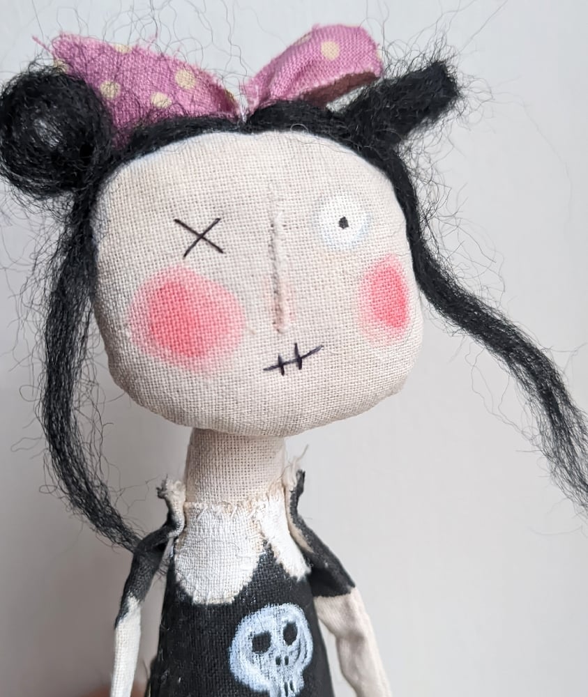 The girl is made from textiles, her face and top are painted with acrylic paint. Her black hair is made from felting wool. I have sewn a skirt on her (not removable) and painted black boots on her feet.